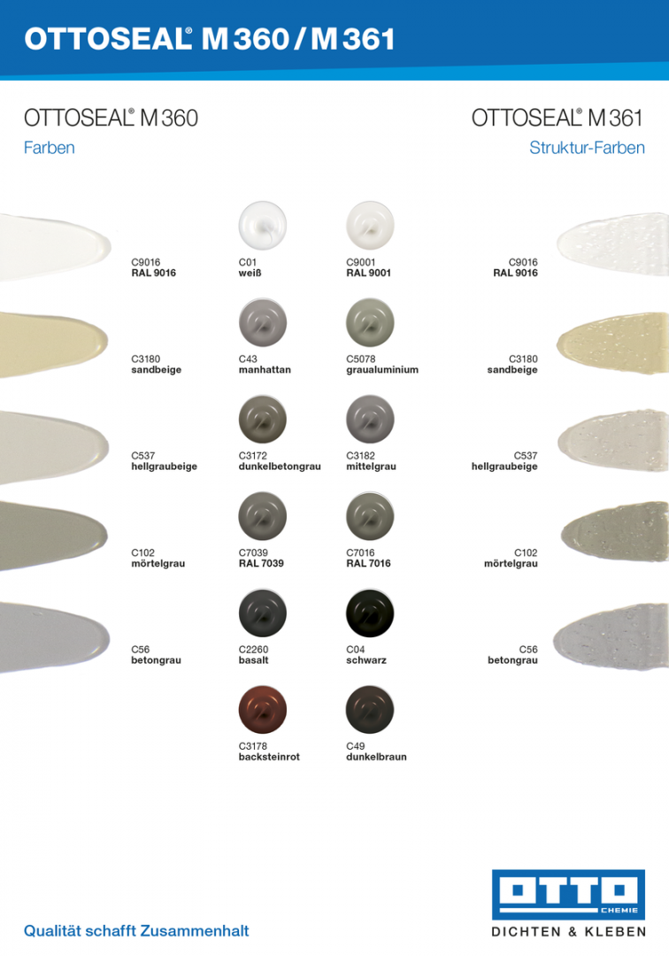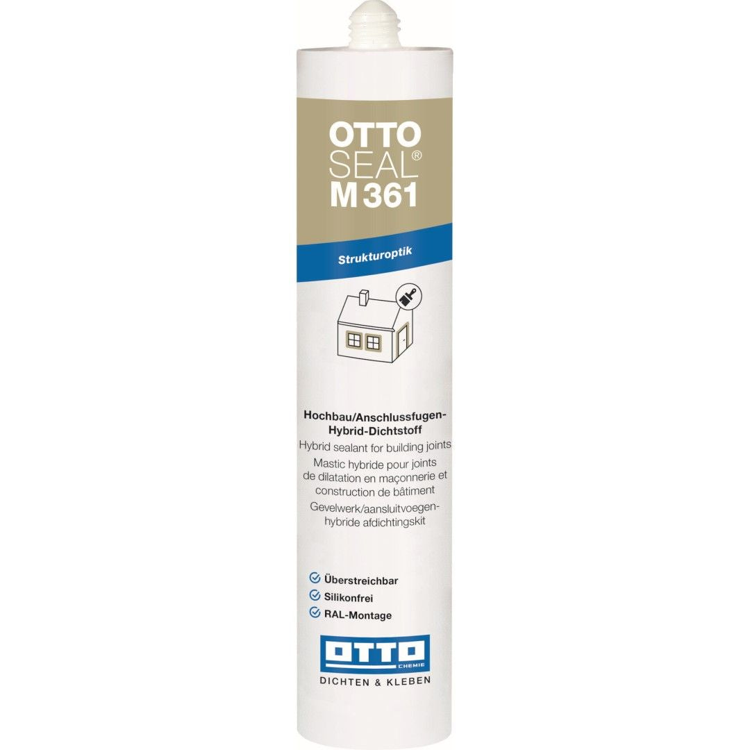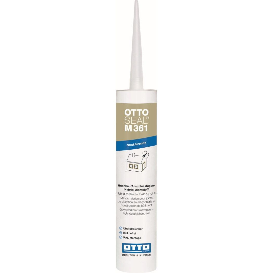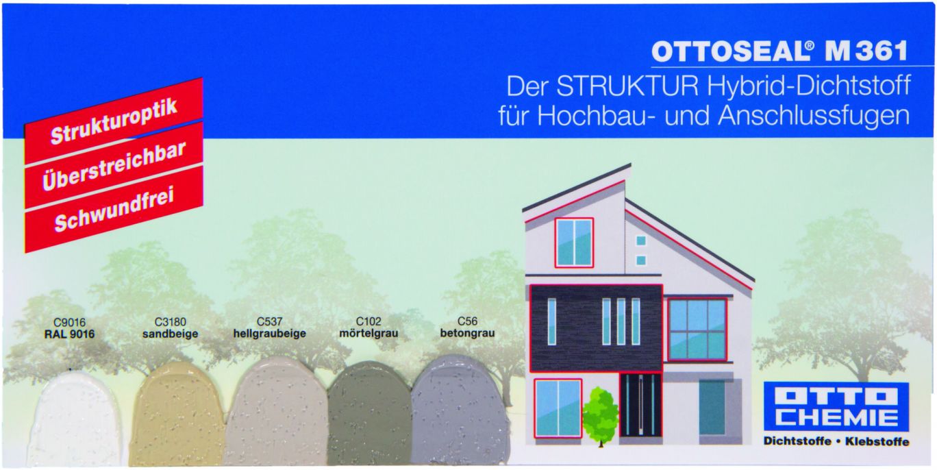 Den strukturelle hybridfugemasse til bygningskonstruktion/forbindelsesfuger, OTTOSEAL® M 361, garanterer et optimalt resultat takket være dens hurtige hærdning uden krympning og bobler, dens lave restklæbeevne og dens evne til at blive overmalet. Dens største egenskab er dog dens granulerede struktur, hvormed fugemassen tilpasser sig perfekt til facadens pudsstruktur. Fugemassen er også ideel til at lukke revner og huller i facader og indvendige vægge, fx ved stillads- og malerarbejde. Desuden annonceres fugemassen til bygningskonstruktionens forbindelse eller forbindelsesfugen mellem vindue og facade.Anvendelsesområder